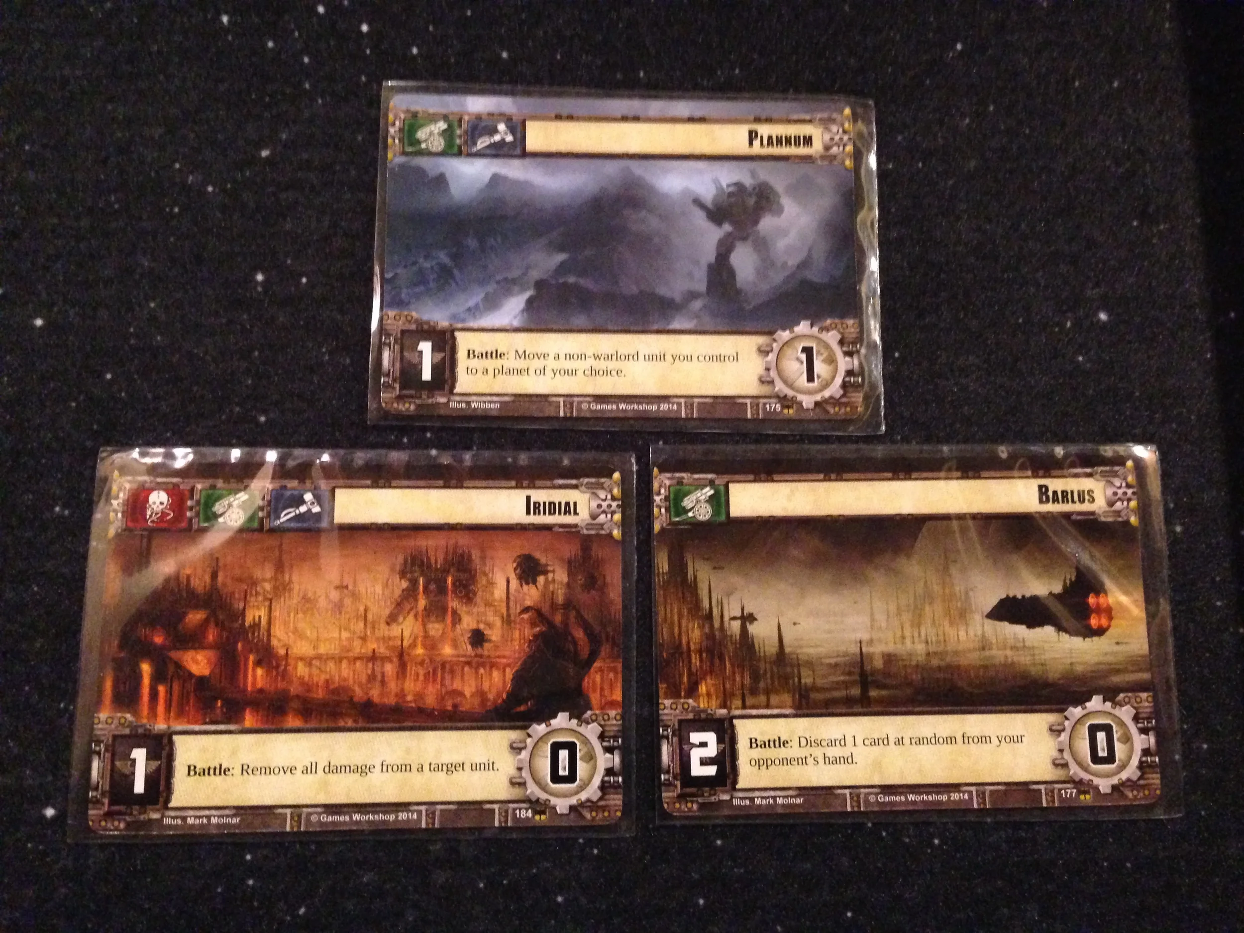 Command--Each player has a dial (similar to the ones used in the X-Wing Miniatures Game), and secretly chooses a planet for the Warlord to visit. You'll determine which Warlord wins the command struggle, and that player gets cards and resources, depending on the planet.