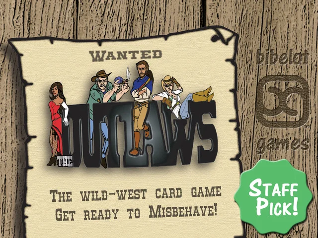 A card and dice game that claims to be for EVERYONE! Wanted: The Outlaws features some really nice-looking laser-etched components. The premise is that you build a town, hire characters, and do jobs. The game plays fast and supports 1-4 players, who are all trying to gain the most "rep" in order to be the baddest outlaw in the land.