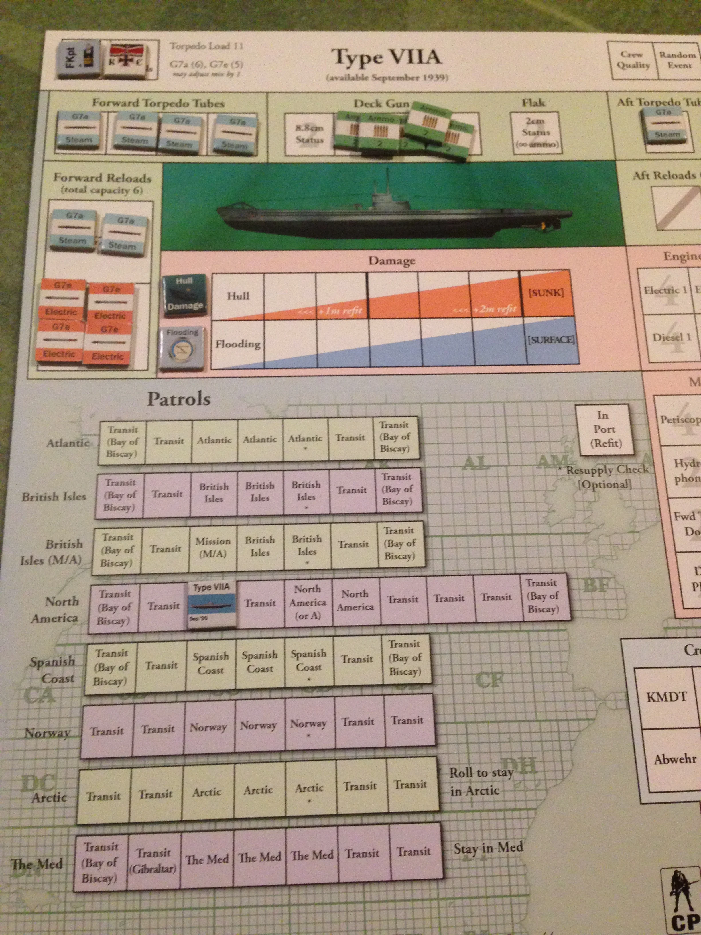 Each boat comes with a specific display mat. This has all the information on your boat, including spots for damage, torpedoes, crew status, and the one you'll be using the most: Patrols.