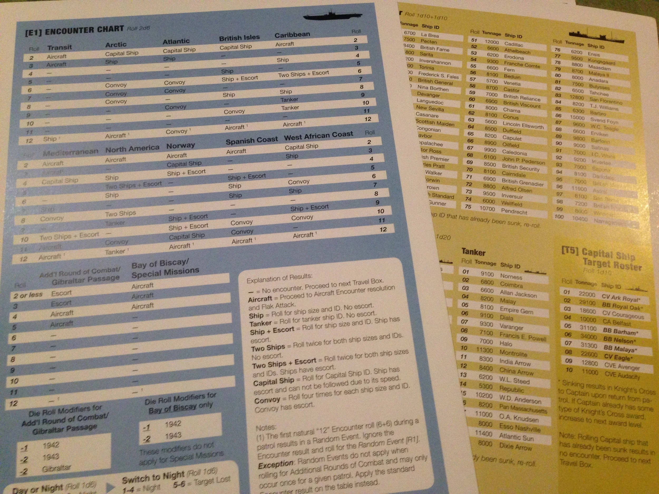 But sometimes you'll roll an encounter. It might be a capital ship, a tanker, a single ship, a ship with an escort, two ships, two ships and an escort, of a convoy (four ships, always with an escort). For tankers and capital ships you roll a 1d10 + 1d10 or a 1d10, respectively, to see which ship, exactly, you've encountered.