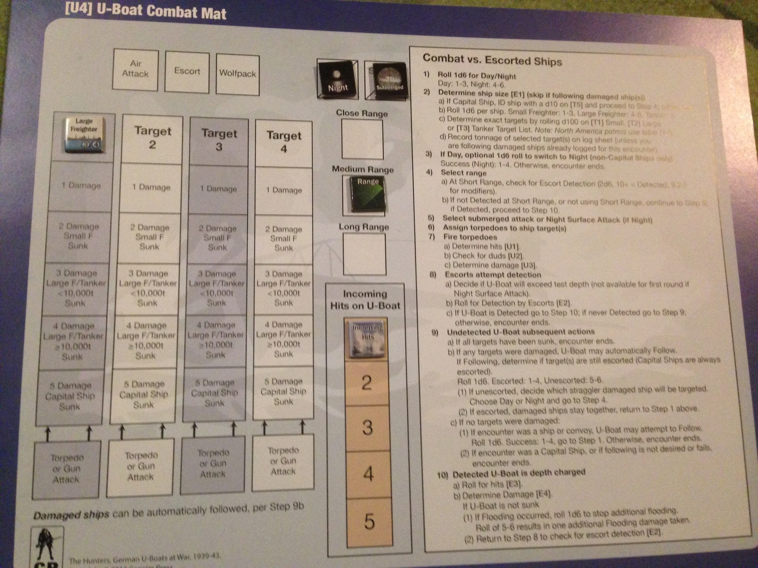 I won't go into everything involved here, but you roll a die to determine if it's day or night (and this imparts DRMs), decide what distance you'll engage from (with more DRMs), roll to see if the torpedoes hit, roll to see if the torpedoes that do hit are duds, roll to see if you sink the ship, roll to see if any escorts find you before you dive away, and then if they do find you, you roll to see what sort of damage they do--if any. As you can see, it involves a lot of dice rolling.