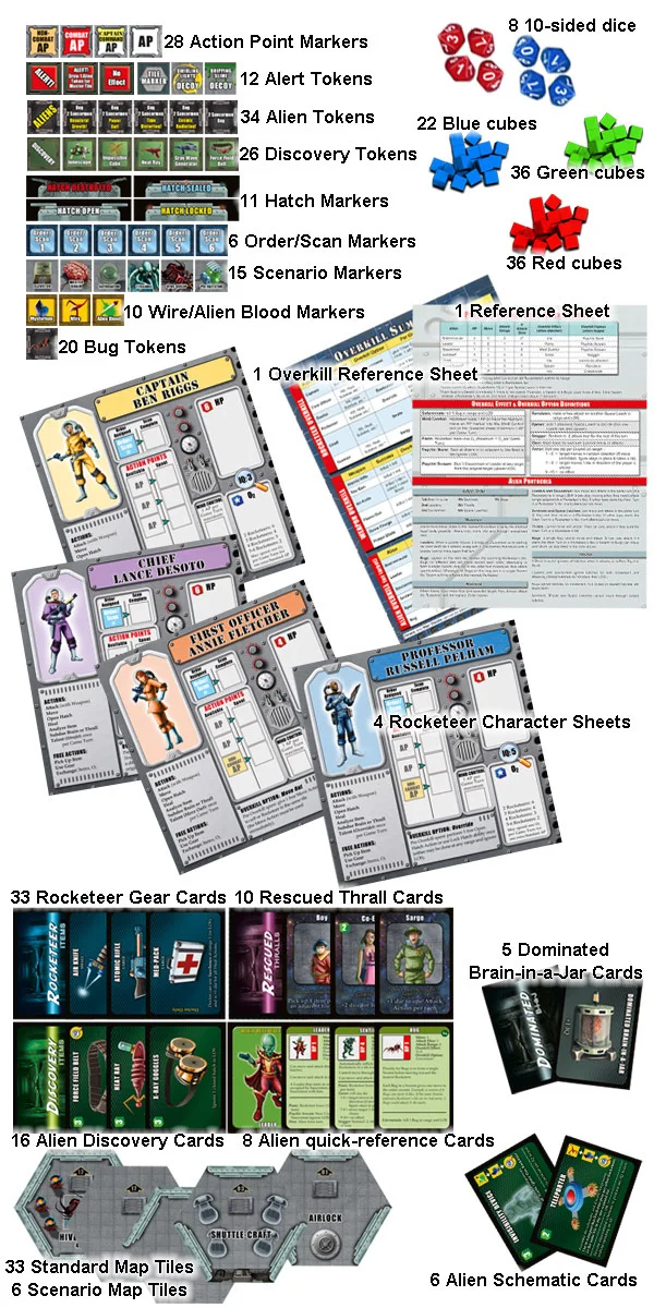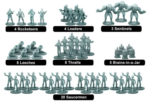 Each turn, Rocketeers spend action points on activities such as firing atomic rifles, analyzing exotic equipment, or subduing the malicious Brain-in-a-Jar. When the Rocketeers are finished, the Aliens take their turns by following simple movement and combat protocols. Seven types of hostile Aliens threaten the Rocketeers, from the repulsive Mind Leeches to the rampaging titanic Sentinels.